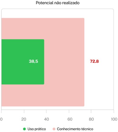 Com 72,8 pontos em conhecimento técnico e apenas 38,5 em autopercepção prática, revelamos o maior gap do mercado brasileiro de IA: não é falta de informação — é falta de confiança para aplicar o que já se sabe.