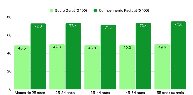 A primeira grande revelação desta pesquisa não vem de um dado isolado — vem da distância entre dois números. O Brasil demonstra um domínio técnico-conceitual sobre IA que surpreende positivamente: 72,8 pontos em conhecimento factual.