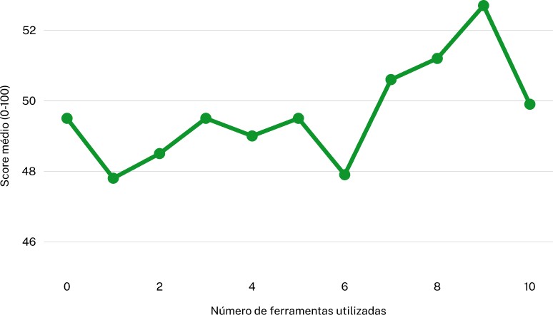 Profissionais com 7 ou mais ferramentas de IA no repertório atingem scores consistentemente acima de 52 pontos — ultrapassando a média geral de 49,2 em todas as dimensões. A hipótese: a diversidade de ferramentas cria um mapa mental mais rico de possibilidades, forçando o profissional a entender os fundamentos de IA em vez de apenas os atalhos de uma ferramenta específica. Dominar um ecossistema diverso exige e desenvolve pensamento estrutural sobre IA.