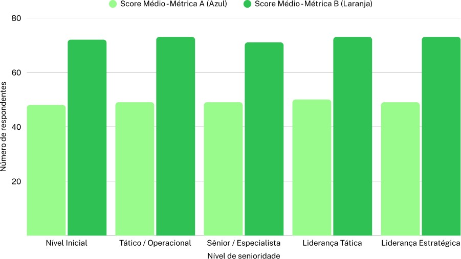 A implicação prática para organizações é profunda: programas de IA desenhados apenas para requalificar juniors ou, no extremo oposto, apenas para capacitar lideranças, estão perdendo o ponto. Toda a organização precisa ser desenvolvida simultaneamente — com abordagens que respeitem o contexto de cada função, não o nível hierárquico. A liderança estratégica (50,8) avança minimamente sobre o nível inicial (49,0), sugerindo que seniores trazem vantagem de contexto aplicado, mas não de domínio técnico.