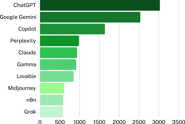 Número de menções de uso por ferramenta de IA; n=3.109; múltiplas respostas permitidas; 2025