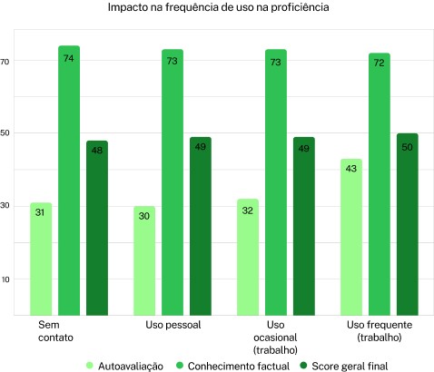 Uma das descobertas mais contraintuitivas desta pesquisa: a frequência de uso de ferramentas de IA não eleva o conhecimento técnico — mas transforma profundamente a confiança prática. Um profissional que usa IA diariamente tem o mesmo score factual (72,5) que um usuário esporádico (74,0). O que muda radicalmente é sua percepção de capacidade: 42,6% contra 30,0%.