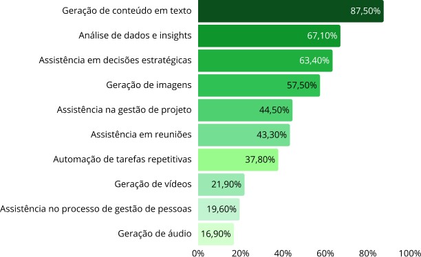 Geração de conteúdo domina os casos de uso; automação de tarefas ainda é subutilizada