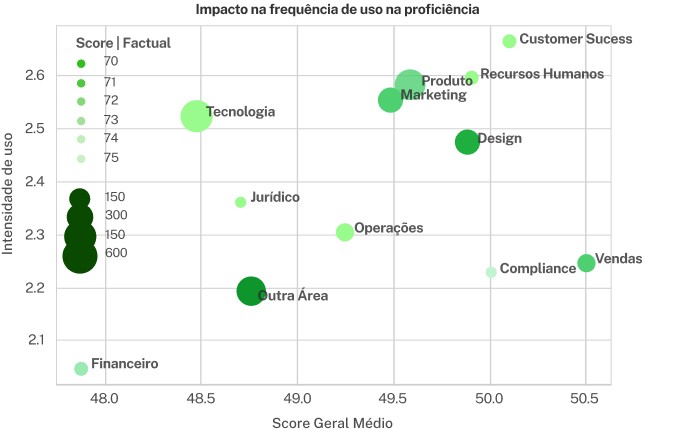 A variação mínima de proficiência entre senioridades revela uma oportunidade: Coordenadores e Gerentes são o grupo com maior potencial de alavancagem, pois influenciam diretamente a adoção de suas equipes sem o distanciamento operacional dos C-Levels.
