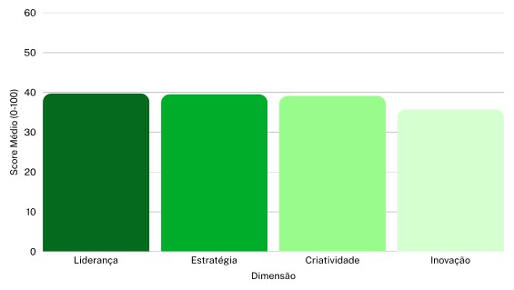 O mercado brasileiro de IA apresenta um padrão de maturidade relativamente homogêneo entre as dimensões de Liderança, Estratégia e Criatividade — todas entre 39 e 40 pontos. O verdadeiro gargalo está na quarta dimensão: Inovação e Cultura, com 35,7 pontos, significativamente abaixo das demais.