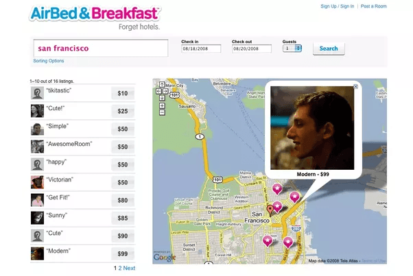 Você pode não acreditar mas essa é uma das primeiras versões do site do AirBnb. Será que você “esqueceria os hotéis” como era a sugestão da assinatura da marca e utilizaria esse serviço? Muita gente conseguiu alugar quartos e hoje é a maior rede hoteleira do mundo, sem ter um imóvel próprio. É fácil, rápido e simples de navegar para encontrar, reservar um quarto e viajar o mundo todo conhecendo pessoas.