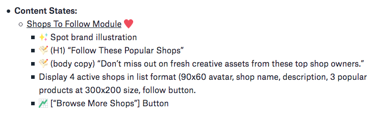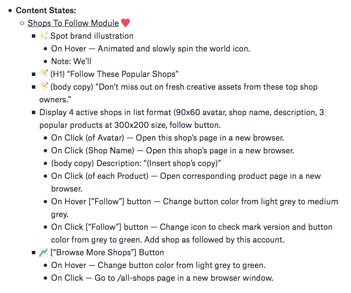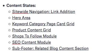Edição de estados de página existentes: se estiver editando apenas um ou mais elementos individuais ou áreas de conteúdo em um Estado de Página existente e deixando o restante do conteúdo intacto, adicione uma observação simples que define onde cada Estado de Conteúdo deve ser colocado na hierarquia da página (por exemplo, “observação: insira isso entre o início de navegação no resto do site e o título do produto”). Evite listar todo o conteúdo da página para evitar redundância e confusão.