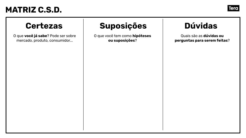Um dos mais importantes frameworks de trabalho atuais é a Matriz CSD. Essa ferramenta de gestão de projetos permite que times de desenvolvimento façam levantamentos do status atual de cada um dos trabalhos que estão realizando. Para isso, há uma representação gráfica com três colunas: certezas, suposições e dúvidas.