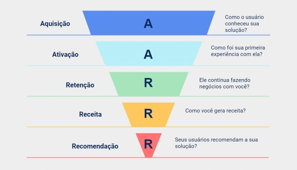 O nome original do funil pirata é AARRR, sigla que representa as suas cinco fases:
