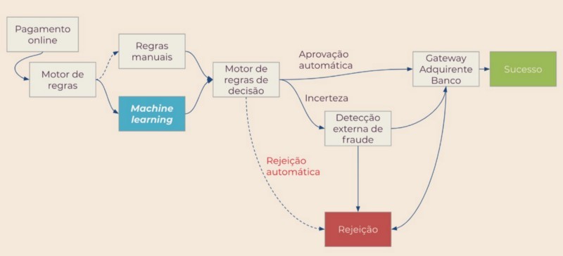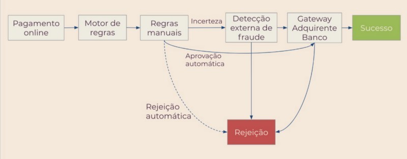 Antes de criarem um produto de dados para prevenir as fraudes, o processo era bastante padrão. As transações passam por um motor de regras, pautado em um sistema de regras manuais, que as direcionam para uma aprovação automática, uma rejeição automática ou, em casos de incerteza, um serviço terceirizado de detecção externa.