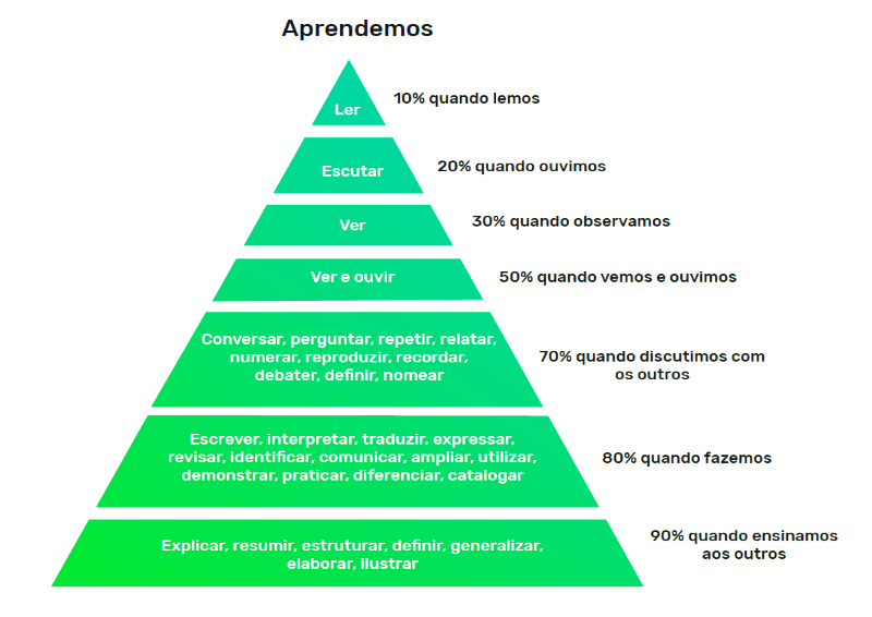 Na pirâmide de aprendizagem de William Glasser, podemos ver como essa forma de comunicação em sala de aula ajuda no desenvolvimento das pessoas — tanto quem senta para aprender quanto quem se levanta para ensinar: