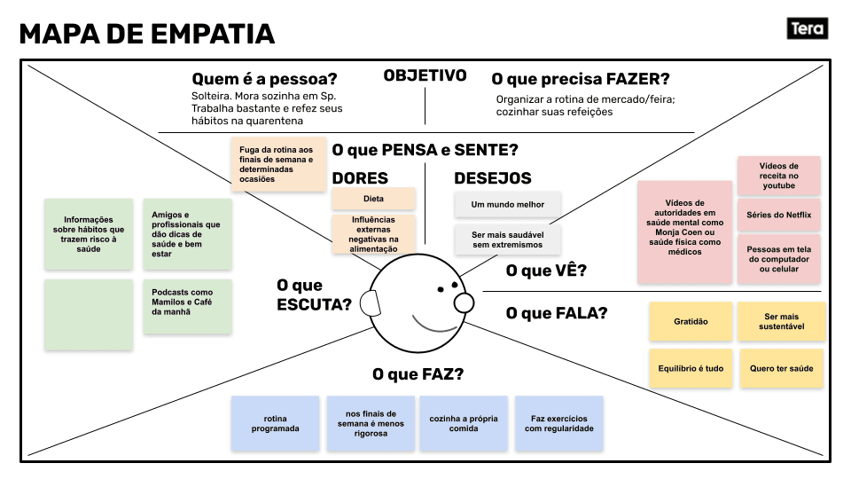 A ideia que baseia a disposição dessas informações é garantir que haja um entendimento do que deve ser priorizado nas entregas, visando o bem-estar e o que essa persona precisa. Neste caso do exemplo, o mapa foi construído em um curso da Tera, em que o projeto era para uma empresa fictícia de marmitas saudáveis.