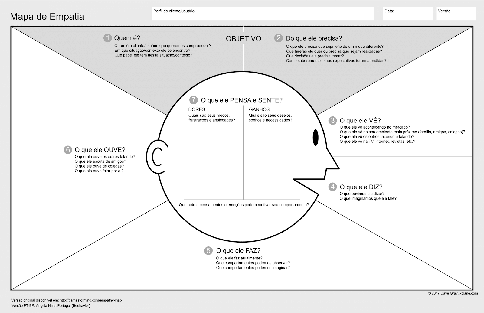O mapa de empatia vai ser a ferramenta ideal para mapear esses pensamentos e sentimentos da sua persona. Existem diferentes frameworks de mapa de empatia, mas trouxemos abaixo um dos modelos mais completos, desenvolvido por Dave Gray, da consultoria de Design Thinking XPlane, e traduzido por Angela Halat Portugal, da Beehavior.