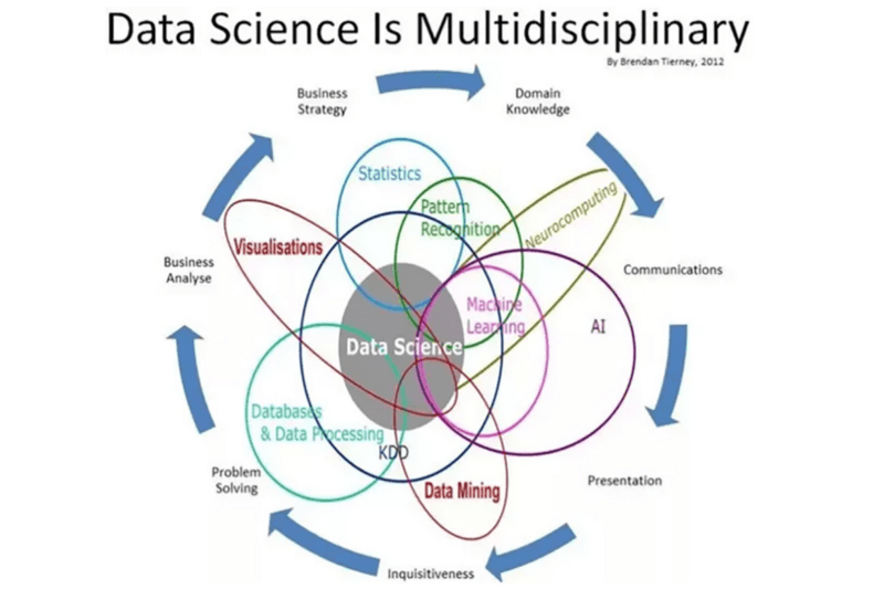 Mas os dados nem sempre vêm de máquinas ou processos mecânicos, e por isso a ciência de dados vai além do ML ou mesmo da Inteligência Artificial. Dados podem ser coletados manualmente, em pesquisas de pequena escala, por exemplo (o que também nos lembra que nem tudo é big data), e há todo um espectro de processamento de dados que, apesar de englobar, não são restritos a algoritmos e estatística.