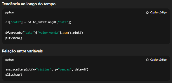 Visualização é uma extensão do raciocínio analítico. Em Python, essas visualizações são criadas com poucas linhas de código usando bibliotecas como Matplotlib e Seaborn, permitindo explorar padrões, comparações e tendências visuais.