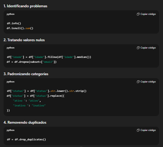 Durante a limpeza, você vai decidir como tratar valores nulos. Na prática, essas decisões aparecem diretamente no código. Em Python, a biblioteca Pandas é usada para identificar valores ausentes, corrigir tipos de dados e remover duplicidades, como no exemplo abaixo.