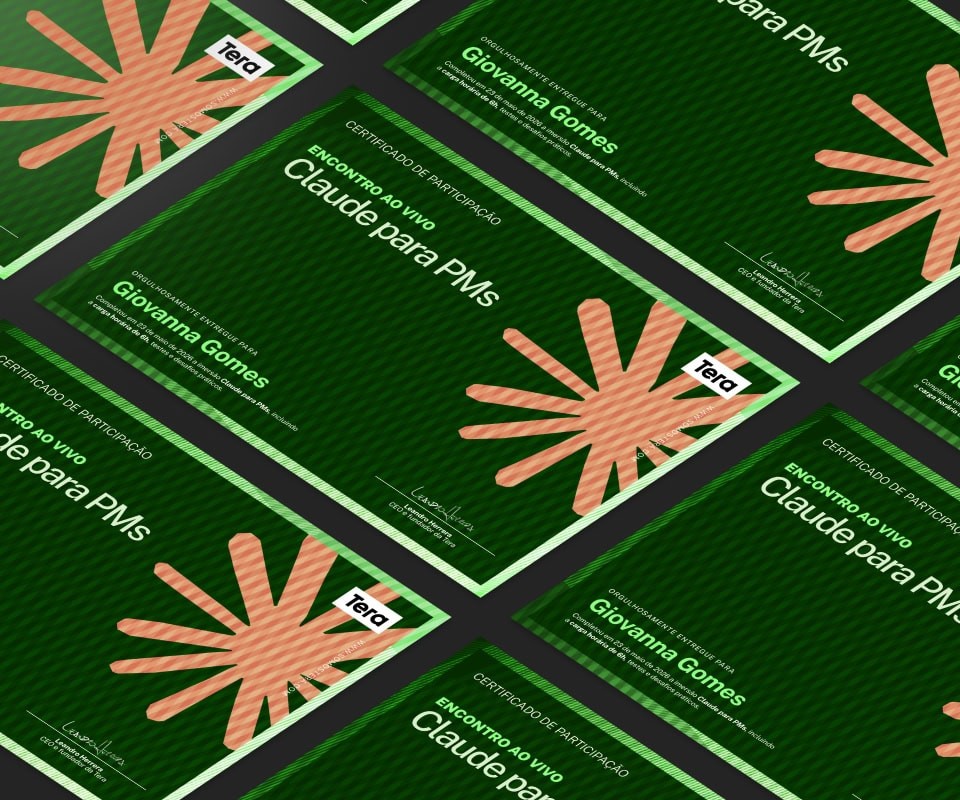 Ao concluir a imersão, você recebe um certificado oficial emitido pela Tera, referência em educação para profissionais de tecnologia e produto no Brasil.